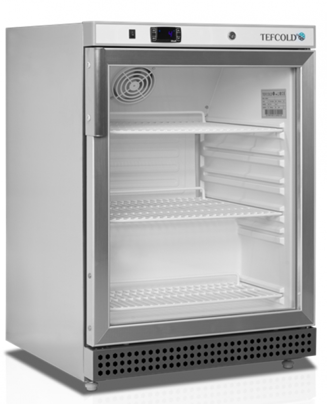 TEFCOLD UR 200 SG. Prosklená nerezová chladicí vitrína skříňová, užitných 119 litrů