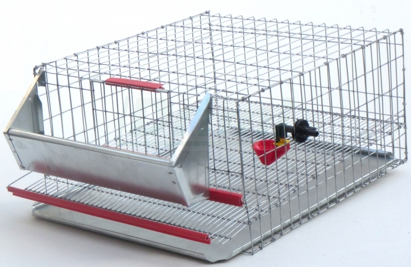 - Součástí klece je vnější závěsný žlab na krmivo a automatická napaječka