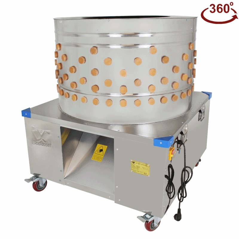 - Doporučujeme především pro škubání krůt a hus. Škubací stroj je určen pro soukromé účely a pro malé rodinné farmy s potřebou škubání cca 100 ks měsíčně. Škubací stroj je výkonným a nepostradatelným pomocníkem pro každého, kdo má co do činění s drůbeží porážku. Tento speciální mokrý-škubací stroj není náchylný k poruchám. Rychle, čistě a bezpečně oškube drůbež bez poškození kůže. Škubání probíhá velice efektivně a tak čistě, že ručním způsobem nemůže být nikdy dosaženo takovýchto výsledků. Celonerezové provedení stroje z 1,5mm silného plechu zaručuje dlouhou životnost, pokud se škubačka nebude přetěžovat. V podstatě jediný předmět údržby je občasné vypnutí dvojice klínových řemenů, případně jejich výměna. Rovněž výměna gumových prstů je předmětem běžné údržby a opotřebení prstů je přímo úměrné zatížení, neboli četnosti používání. Škubačky jsou dodávány s ochrannou folií na lícové straně oplechování. Folii doporučujeme strhat, bohužel to jde velmi pomalu. Stroje jsou vybaveny motorem na 380 V, 50 Hz. vypínačem s krytím IP 54 a 5m dlouhou gumovou flexi šňůrou s pětikolíkovou zástrčkou, 16A. Motor lze přepojit na 400V. Doporučujeme proudem vody z hadice průběžně odplavovat oškubané peří, které je možné zachytit do perforované přepravky, nebo síta. Není dovoleno stříkat vodu na vypínač. Voda volně odtéká na zem splavem. Ve spodní části karuselu jsou 3 prsty nasazeny opačně a slouží jako vyhazovač peří . Před čištěním vždy vytáhněte zástrčku ze zásuvky. Pozor ! Obsluha musí mít kvalitní gumové holínky, gumové rukavice a obličejový štít ! Provoz: Poražená zvířata, je třeba dobře vykrvit, pak hned opařit a vložit do škubačky. Opaření lze provést nejlépe v elektrickém kotli s regulací teploty – s termostatem k.č. 56103 nebo v jakékoli vhodné nádobě s využitím ponorného ohřívače 2300 W z naší nabídky k.č.90801 - 2. Kuřata, slepice, krůty, perličky, koroptve a bažanti při cca 62 °C (mírně vyšší u starších zvířat) Doba opaření je v závislosti na velikosti - 1,5 až 2 minuty. Husy a kachny, teplota 70°C - 72°C . Doba paření za stálého protřásání cca 4 – 5 minut. K dosažení správného výsledku je třeba provést trhací zkoušku na letkách. Výsledky práce se ještě více zkvalitní použitím škubacího vosku rozpuštěném v lázni! Vodní drůbež jde obecně špatně škubat, proto doporučujeme na 10 - 15 sekund vložit do škubačky, za tuto dobu se oškube peří z měkkých částí těla ptáka a i svrchní kryt se proškube. Potom pokračovat v paření ještě cca 2 minuty. U vodní drůbeže je použití vosku téměř nutností. Orientační doba potřebná k oškubání jednotlivých druhů drůbeže: Kuře: 3-4 kusy během 20 - 40 sekund. Krocan: 1 kus za 40 - 50 sekund. U krůt doporučujeme odstranit pařáty. Bažant: 3 - 5 kusů během 40 sekund. Kachny: 3 - 4 kusy asi za 60 sekund. Husy: 1 - 2 kusy asi za 60 sekund. Uvedená doba škubání je pouze orientační, v praxi se jedná o více vlivů jako je teplota a doba paření, stáří drůbeže, roční doba, okolní teplota, použití škubacího vosku atd. Vyhněte se porážce v období přepeřování.