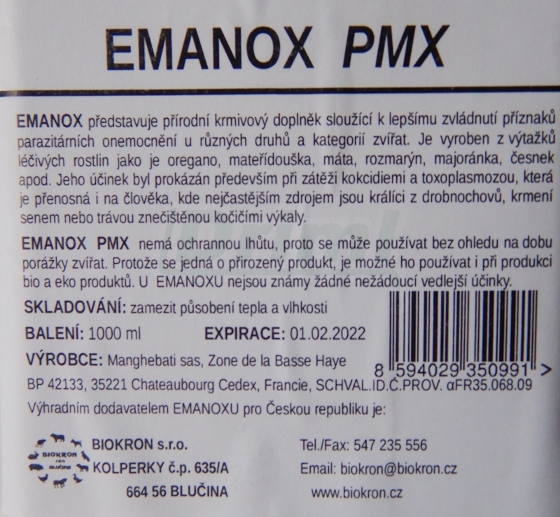 (oregáno, mateřídouška, máta, rozmarýn, majoránka, česnek apod.) - EMANOX PMX se používá k prevenci i léčbě kokcidiózy u všech druhů zvířat,