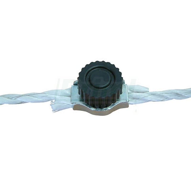 Výlisek z pozinkovaného plechu doplněný tvarovanou podložkou a matkou s plastovým obalem. Použítí při spojování ohradníkových lan bez použití nářadí!