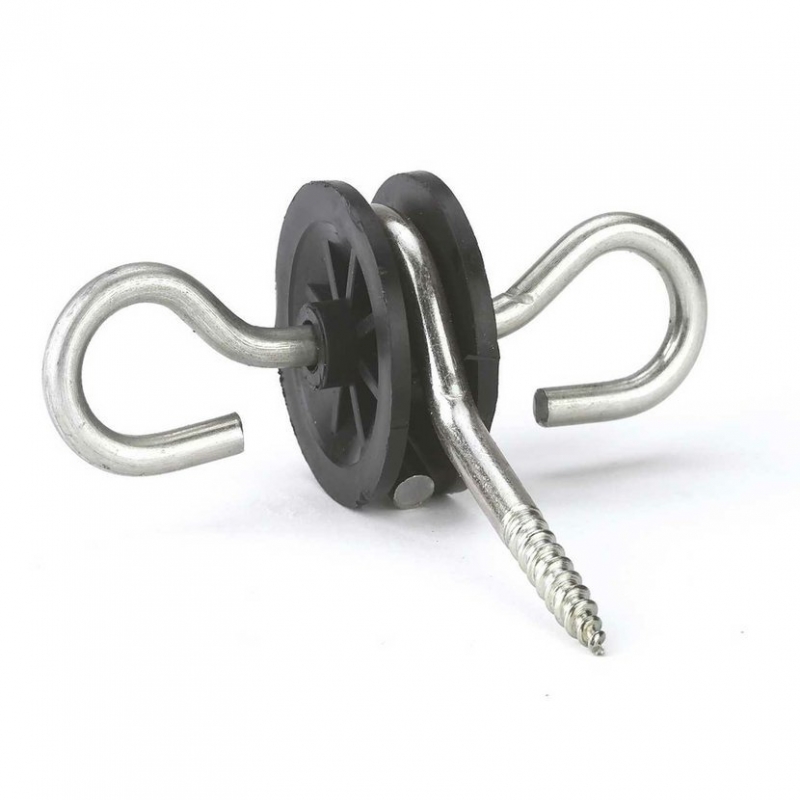 Izolátor koncový k brance s vrutem prům. 6 mm, 2 oka Koncový izolátor je doplněn dvěma kovovými oblouky. Na jeden lze připojit koncový vodič ohrady a na druhý se zahákne háček z vchodové branky. Izolátor se do sloupku zašroubuje.