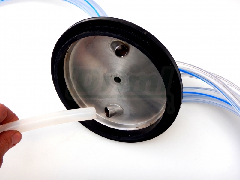 - Propojovací - sací silikonová hadice k nasunutí do mléčné trubice ze spodní strany dojicího víka s nerezovou trubkou 22x2mm, která slouží jako zátěž, aby savice nevyskočila z kbelíku. Hadice je použitelná oboustranně.
