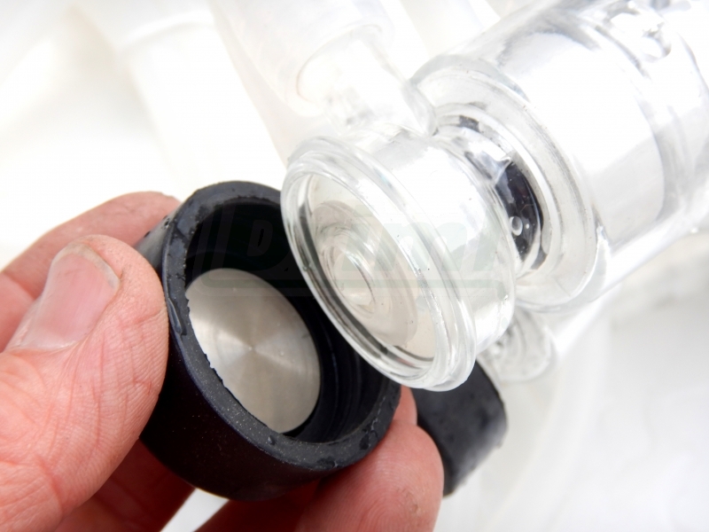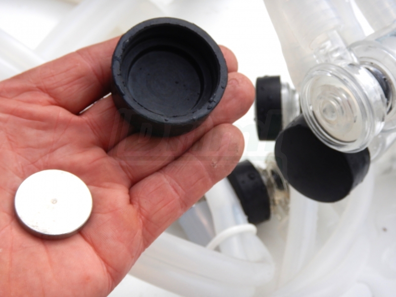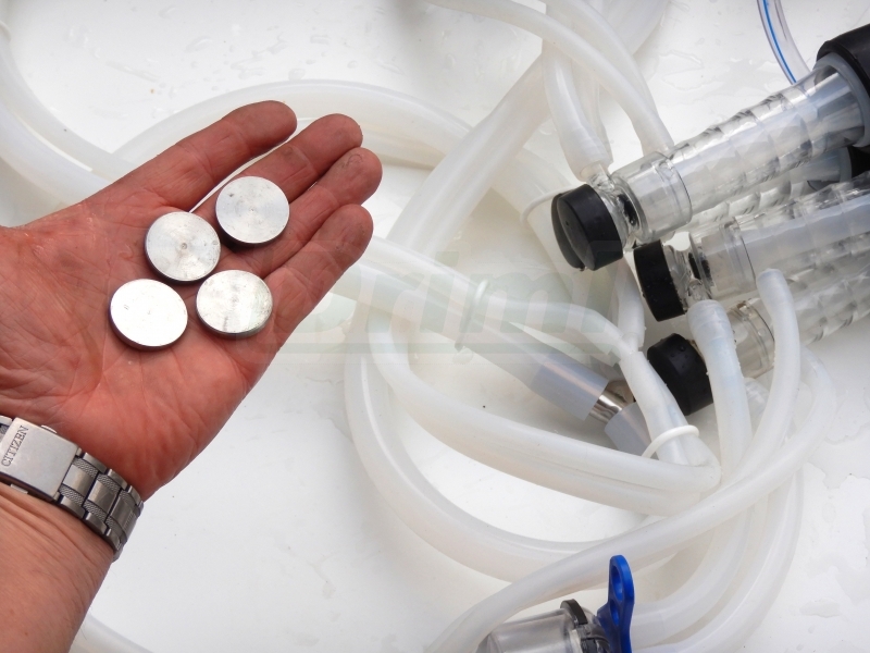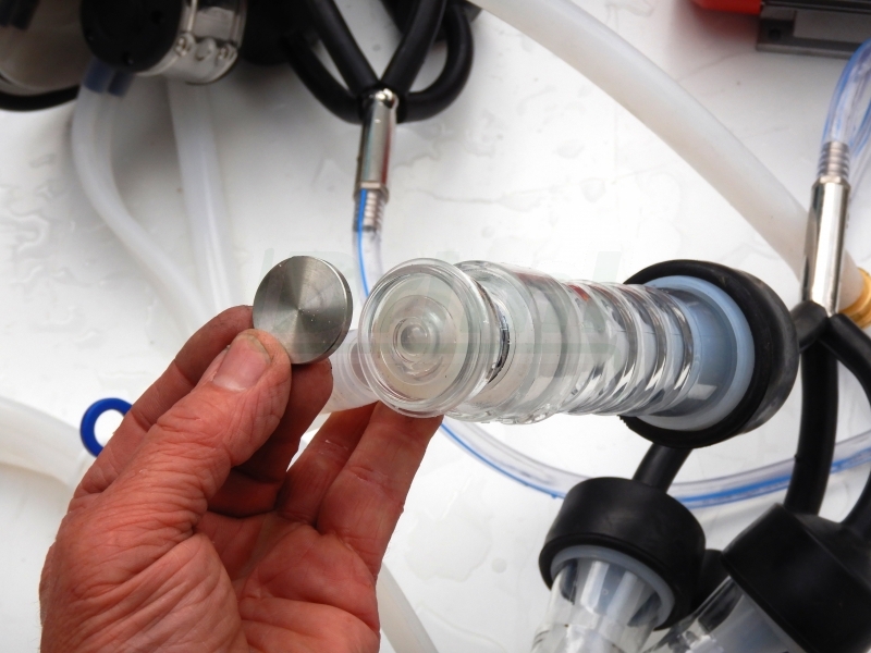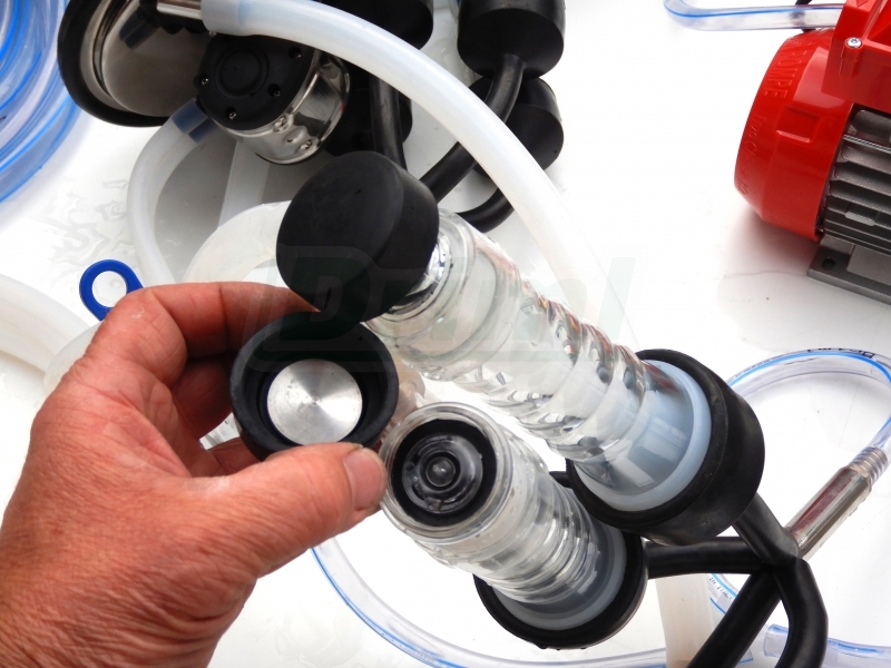 - 2 x propojovací silikonová sací hadice k nasunutí do mléčné trubice ze spodní strany dojicího víka kužolovými konci. Na hadici je navlečena nerezová trubka, která slouží jako zátěž.