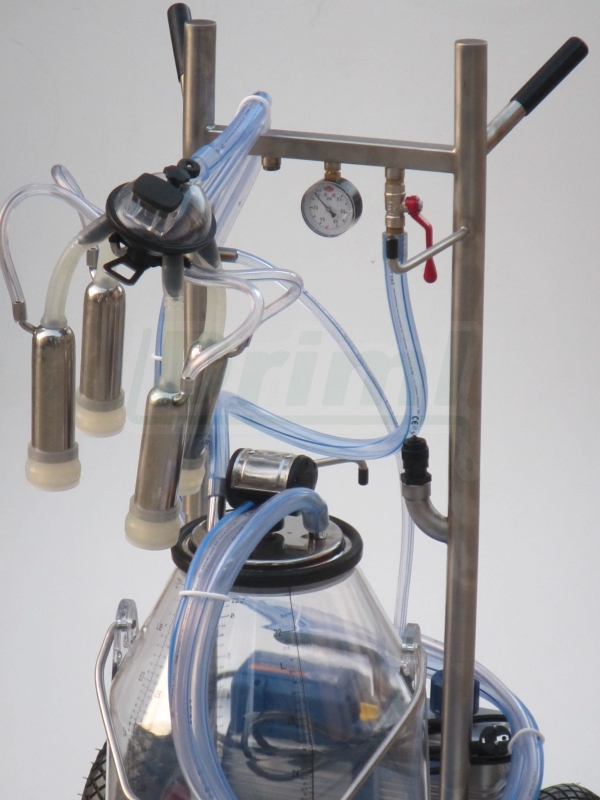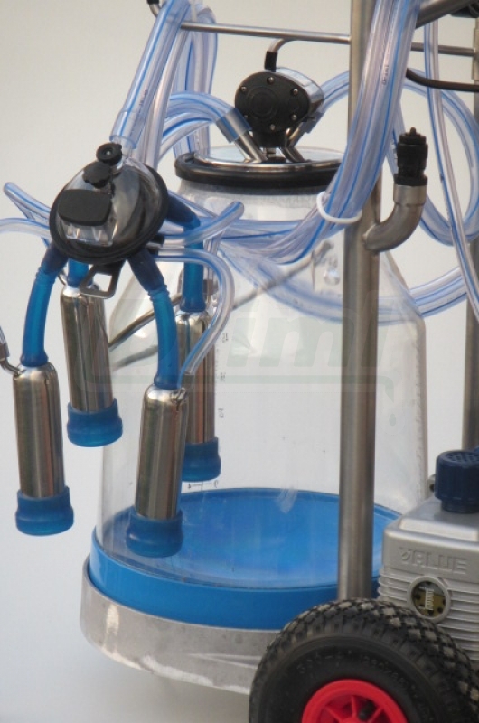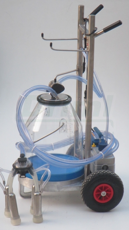 Mini dojení DRIML je velmi lehké, pohyblivé, s neotřele jednoduchým a účelným designem. Protáhne se v nouzi dveřmi 60cm a lehce jezdí i po schodech! Velmi tichý dojicí poloautomat je velmi šetrný jak ke zvířatům, tak i ke karpálním nervům v zápěstí dojiče. Mléčná hadice s průřezem 14mm je transparentní, umožńuje sldovat proudící nadojené mléko. Také je jasně vidět, kdy je hotovo. Dobře a rychle se čistí. Mléčná hadice, a dvojice vzduchových hadic je dlouhá 2m a je zakončena sběračem mléka 240 ml s transparentním víkem