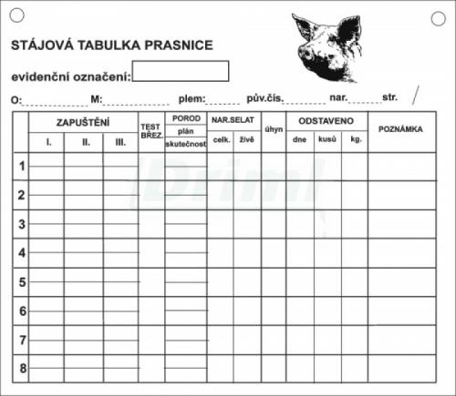 Praktické stájové tabulky pro prasnice, vyrobené z tvrzeného polystyrenu. Zapisování údajů je možné lihovými fixy. Zápis je odolný proti smývání vodou. Při změně prasnice lze smýt zápis lihem a tabulku použít pro novou prasnici. Na přání zákazníka lze vytisknout jakýkoliv motiv (s ohledem na množství).