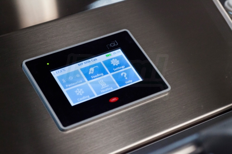 - Míchací motor s automatickým ovládáním otáček pro pomalé míchání během pasterizace mléka a rychlé míchání při rozmíchání prášku (sušeného mléka)