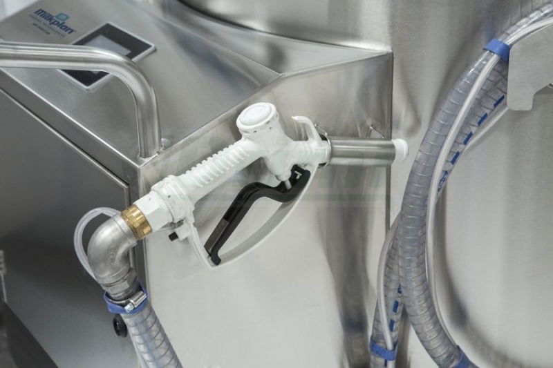 - Po skončení procesu pasterizace připravená nádrž se studenou vodu rychle snižuje teplotu mléka v pojízdném pasteru na nastavenou teplotu pro podávání telatům.