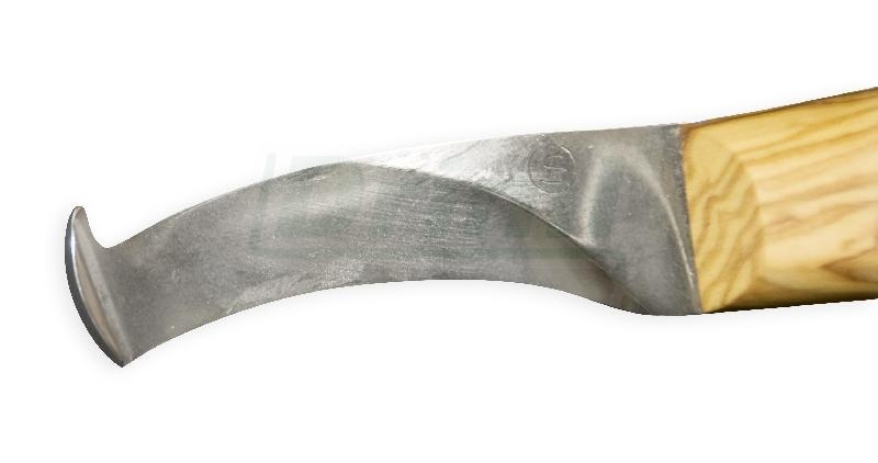 DOUBLE < S > RHINO DELUXE pravý je speciální jednostranný kopytní nůž s jemně prohnutým ostřím a velmi jemným dlouhým háčkem, což umožňuje lepší vedení nože kolem střelky. Super kvalita ostří ze speciální oceli a velmi jemným výbrusem umožňuje přesný a hladký řez do rohoviny. Ergonomicky tvarované madlo z krásného a tvrdého olivového dřeva perfektně sedí v ruce. Profesionální nářadí na nejvyšší úrovni. Pro zkušené kopytáře