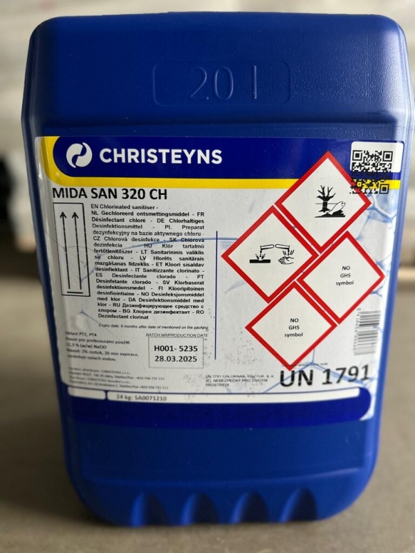 Přípravek MIDA SAN 320 CH je dodáván v balení kanystr . Používejte biocidní přípravky bezpečně. Před použitím si vždy přečtěte údaje na obalu a připojené informace o přípravku.