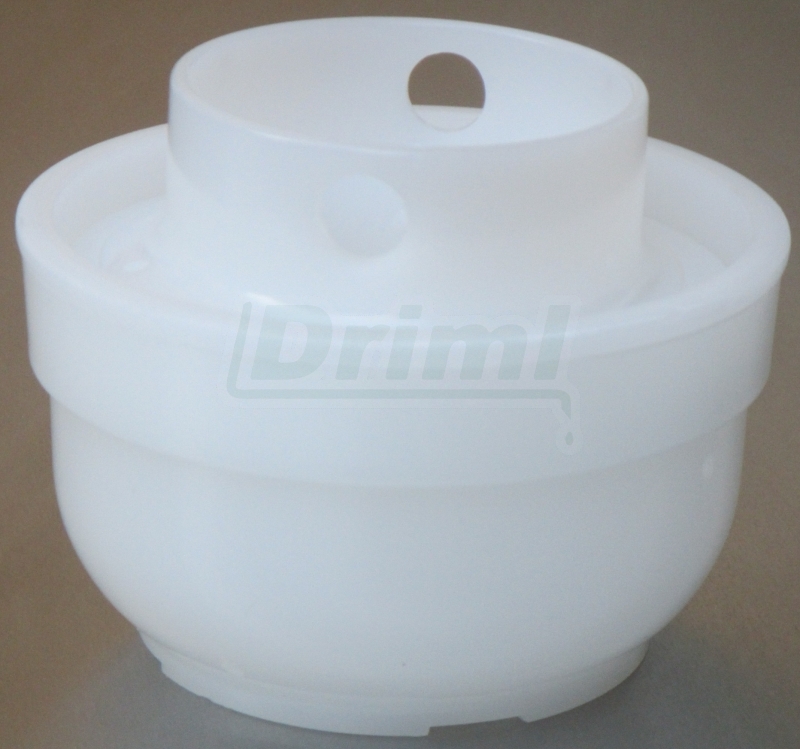 - víko dosahuje téměř až na dno formy (k zaoblené hraně), tím lze regulovat výšku a váhu vyráběného sýra