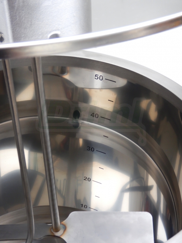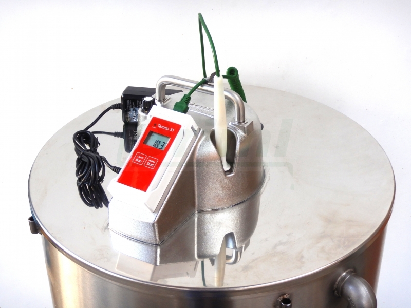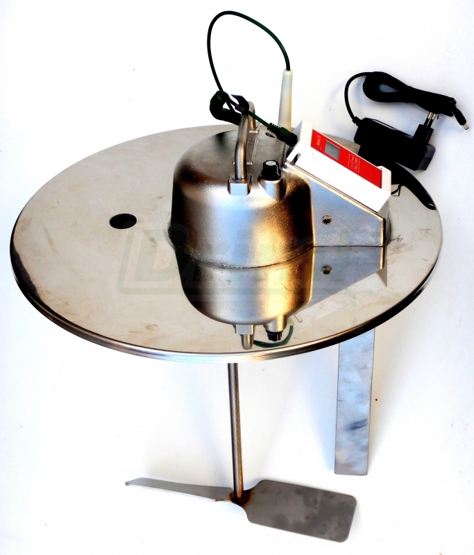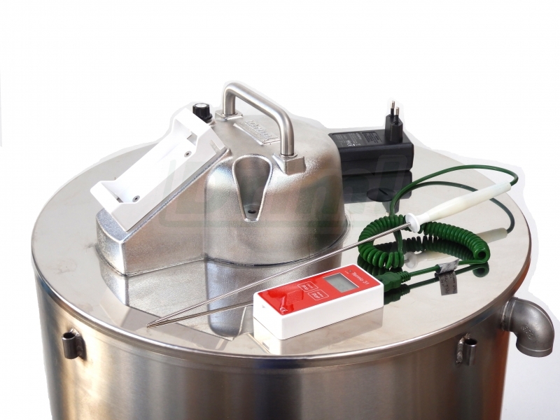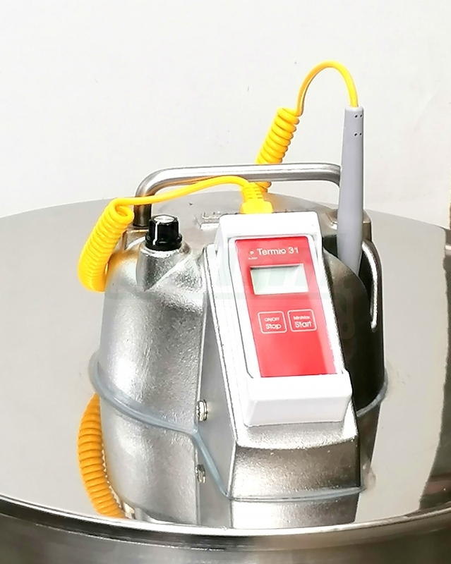 - Motor míchadla s potenciometrem regulace otáček a displej teploměru jsou umístěny v nerezové hlavě víka pastéru.