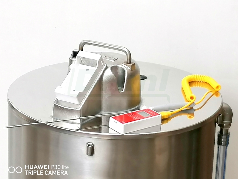 - Ohřívač mléka je dovybaven míchadlem s plynulou změnou otáček vrtule a integrovaným digitálním kalibrovaným teploměrem, se záznamem průběhu teplot v čase, nerezovou teplotní sondou dlouhou 25 cm.