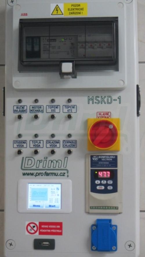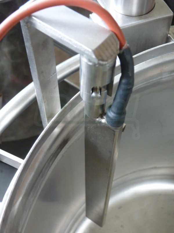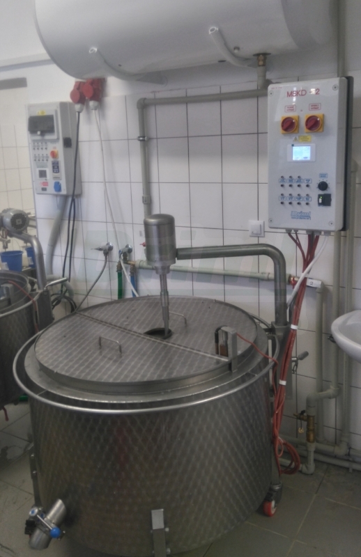 Kotel je určen k pasterizaci mléka a následnou výrobu sýrů a kysaných mléčných výrobků. Jako další využití se nabízí chlazení a uchovávání mléka, možnost vaření piva, pasterizace moštů, výroba marmelád, zavařování ovoce, vaření, provádění zabíjaček atd. Řídící jednotka PLC s dotykovým displejem umožňuje programování ohřevu, výdrží na stanovené teplotě, chlazení, míchání, záznam o průběhu teplot v čase, teplotní diagram - vše v automatickém cyklu řízeném počítačem. Jednoduché ovládání pomocí dotykového displeje s možností vlastního programování a vkládání do paměti. Automatické ukládání dat průběhu pasterizace a dalšího tepelného zpracování na flash disk. V kterémkoli okamžiku řízeného procesu je možné přejít na manuální ovládání základních funkcí kotle. Tato možnost je určena především jako pojistka pro případnou poruchu na PLC řídící jednotce. Manuální ovládání však vyžaduje přítomnost obsluhy. Nad dotykovým displejem jsou umístěny ovládací spínače s kontrolními diodami. V systémovém menu je možné plynule nastavit četnost logování - tedy např. zaznamenávání teploty po 2 sekundách, nebo po 30sekundách. Možnost zobrazení zaznamenaných dat nebo jejich tisku na PC v datech, nebo různých grafech. Podmínkou je otevření souboru v programu Microsoft Excel. Řídící jednotka umožňuje pro snadné opakování technologických postupů naprogramovat 4 předvolby - receptury o třech krocích. Předvolby je též možné kombinovat, čímž dostaneme násobky naprogramovaných kroků. Počítač sbírá data z teplotního a pohybového čidla. Snímač teploty je pevně zabudován v lehce odnímatelném, bajonetovém deflektoru, který zabezpečuje dokonalé promíchání obsahu kotle. Na deflektoru je cejchování litráže pro hrubou orientaci o množství zpracovávaného mléka. Motor míchadla je umístěn na otočné konzole. Snímač otáček míchadla je umístěn v horní části převodovky Po odejmutí míchadla a deflektoru se uvolní aretační šroub a konzola s motorem se vytočí zcela mimo profil kotle. Tím se uvolní pracovní prostor pro krájení syřeniny, či další činnost. Základní otáčky míchadla: 17 ot/min. Certifikát na mazadlo převodovky míchadla pro bezpečný styk s potravinami. Plynulá regulace otáček míchadla (frekvenční měnič) včetně senzoru otáček je již ve standardním provedení! Možnost změny otáček při vymíchávání ocení každý, kdo to s výrobou sýrů myslí vážně! Vrtulové míchadlo je lehce odjímatelné jednou rukou pomocí bezpečnostní pojistky rychlospojky. Lehkým zvednutím volného pojistného kroužku se hřídel míchadla oddělí od motoru (rozpadne se). Toto velice praktické řešení slouží současně jako bezpečností prvek, kdyby došlo k zachycení jedné ruky otáčející se vrtulí, což je velmi nepravděpodobné, protože pomaloběžná vrtule je u dna a ponořená do mléka. Kotlina má dvoudílné víko s průchodem pro hřídel míchadla a deflektor s čidlem. Selenoidní ventily pro přívod teplé a chladicí vody do mezipláště jsou umístěny ze spodní strany. Pro nouzové ovládání jsou určeny dva manuální pákové kulové ventily Odvod chladicí vody je řešen výpustí na 1" hadici. Dno kotle je ploché, na stěny napojené velkým rádiusem a pro úplné vypuštění obsahu je spádované k vypouštěcímu ventilu s klapkou a pojistkou proti nechtěnému vypuštění o průměru 70mm. Konstrukce kotle je dvouplášťová, s bezpečnostním přetlakovám ventilem nastaveným na 1Bar Bezpečnostní zábradlí, které slouží jako madlo k manipulaci, ale i k odkládání nářadí. Ovládací prvky - hlavní vypínač se silovou elektroinstalací a dotykový displej s počítačem jsou umístěny ve společné skříni, která se pověsí na stěnu mimo kotel. Propojení zařízení čtyřmi sdruženými kabely v ochranné, snadno omyvatelné flexibilní trubce. Toto řešení nejlépe splňuje hygienicko bezpečnostní požadavky na každodenní dokonalou očistu. Snadná údržba je podpořena co možná najjednoduššími tvary bez špatně čistitelných zákoutí a štěrbin.